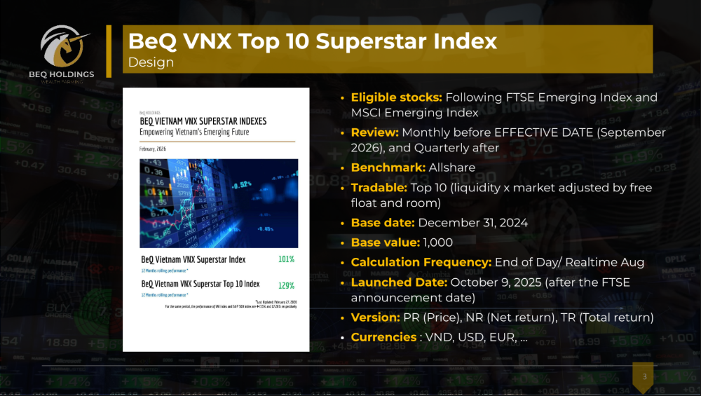 A standout within this system is the BeQ VNX Top 10 Superstar Index—a tradable index designed for direct implementation into investment strategies. By selecting the Top 10 stocks based on liquidity and free-float adjusted market capitalization, combined with a periodic review mechanism, the index captures companies with strong market-leading potential while serving as an optimized portfolio framework.