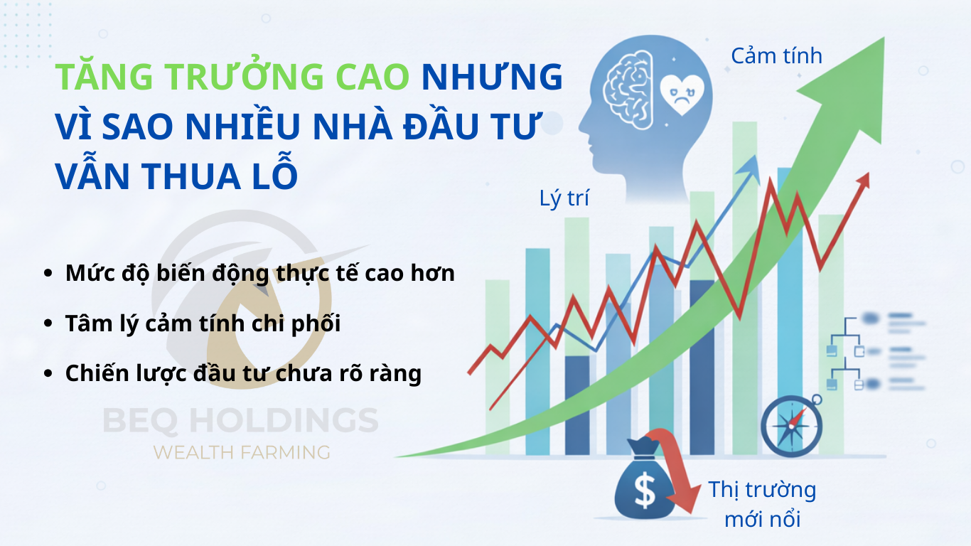 Trong thực tế, những kịch bản quen thuộc thường lặp lại: mua khi giá đã tăng mạnh vì sợ bỏ lỡ cơ hội, bán trong hoảng loạn khi thị trường điều chỉnh và thậm chí sử dụng đòn bẩy đúng vào giai đoạn tâm lý hưng phấn nhất. Từ quá trình theo dõi thị trường, BeQ Holdings nhận thấy thua lỗ không chỉ xảy ra khi thị trường bước vào suy giảm, mà thường bắt đầu ngay từ thời điểm nhà đầu tư chưa chuẩn bị đúng tâm thế đối với mức độ biến động vốn là đặc trưng của các thị trường mới nổi.