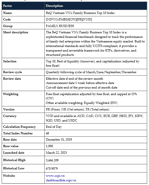BeQ Vietnam VNX Family Business Top 10 Index select the ‘best’ top 10 constituents of the BeQ Vietnam VNX Family Business index in term of liquidity, and adjusted capitalization on free float, remaining room. The index is weighted by the adjusted market capitalization, starting at 1,000 on the base date on December 31, 2024.