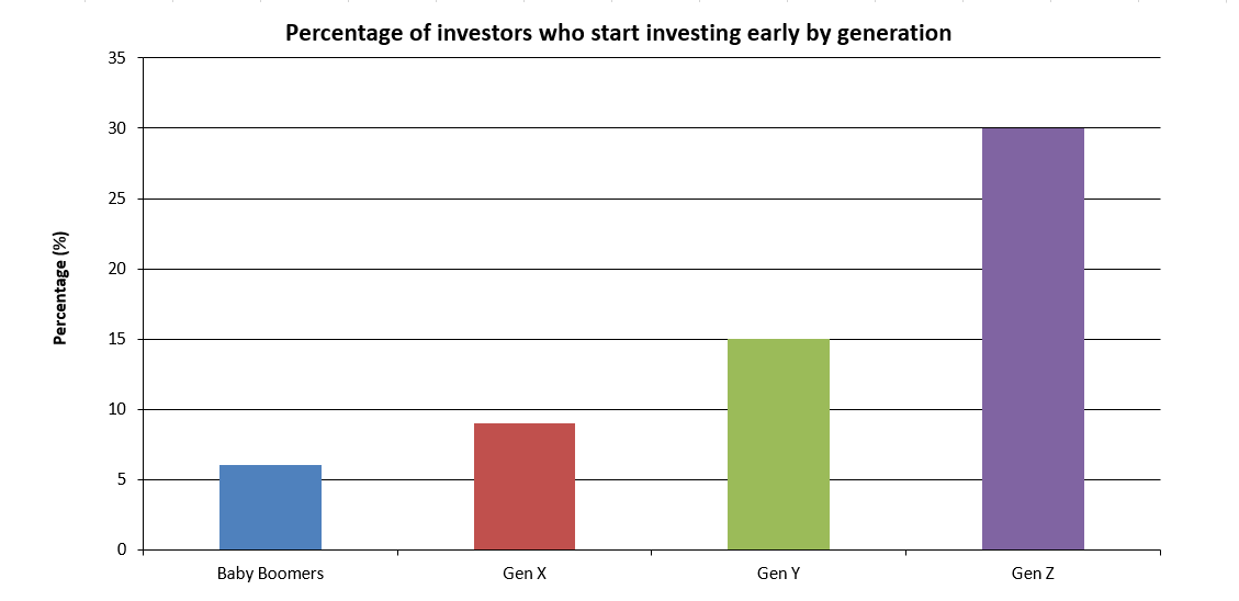 According to the World Economic Forum, approximately 30% of Gen Z globally begin investing in early adulthood—significantly higher than previous generations. This figure reflects a structural shift: young people no longer wait until they have accumulated substantial wealth before investing, but instead enter capital markets at a much earlier stage.